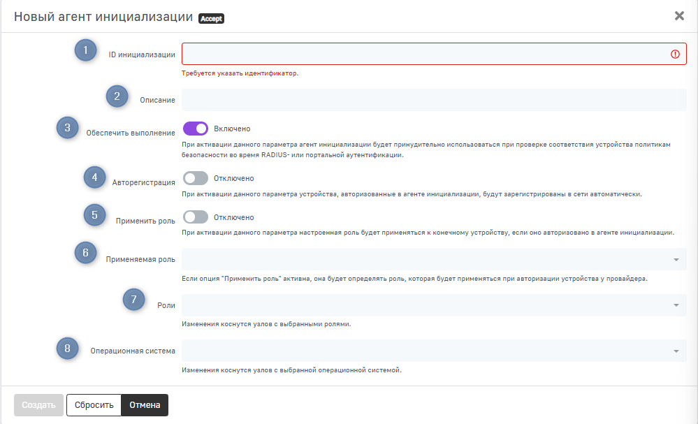 Для того чтобы создать новый агент инициализации, нажмите Новый агент инициализации в левом верхнем углу страницы и в выпадающем списке выберите тип агента Accept. После этого откроется меню конфигурации нового агента инициализации.
