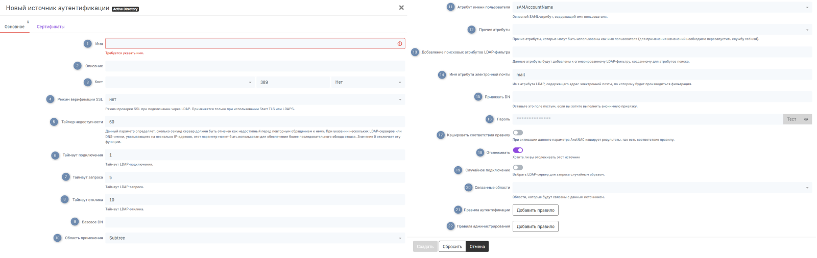 - Имя — имя источника аутентификации, которое будет отображаться в таблице со списком всех источников аутентификации. Задается при создании источника и не может быть изменено в дальнейшем;