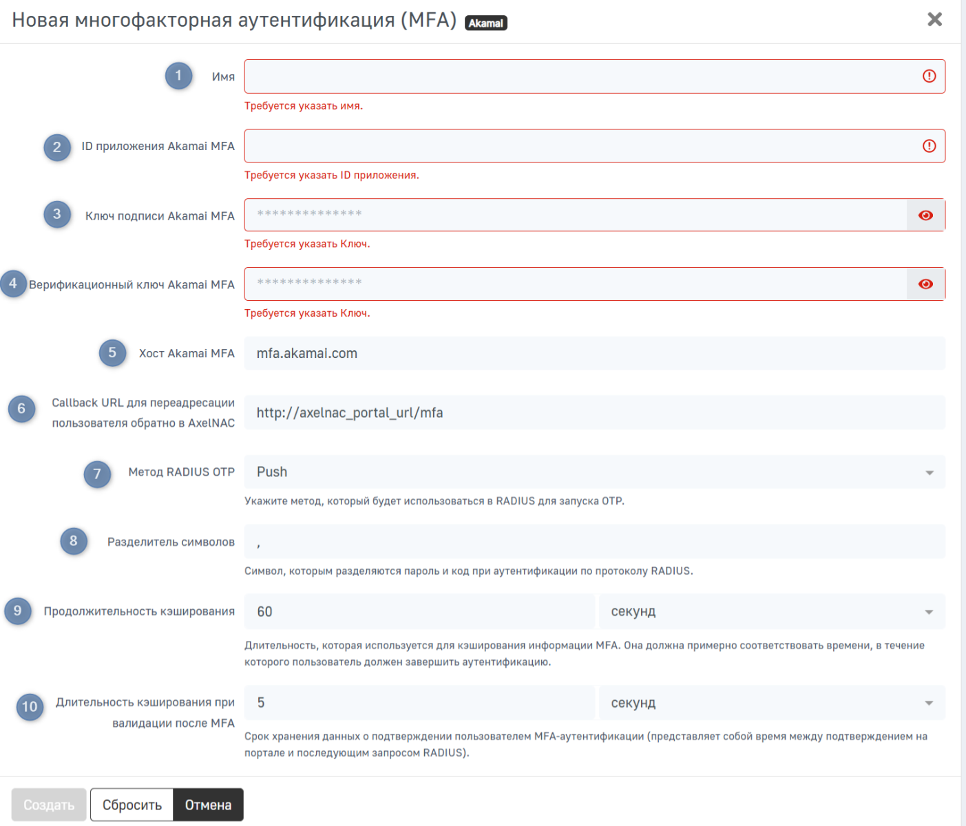 - Callback URL для переадресации пользователя обратно в AxelNAC — параметр, который используется при срабатывании MFA на портале после аутентификации на Akamai Bind v2. Он перенаправляет на этот URL для возврата на портал AxelNAC. Этим значением должно быть FQDN портала с /mfa в конце строки (https://portal.example.ru/mfa);