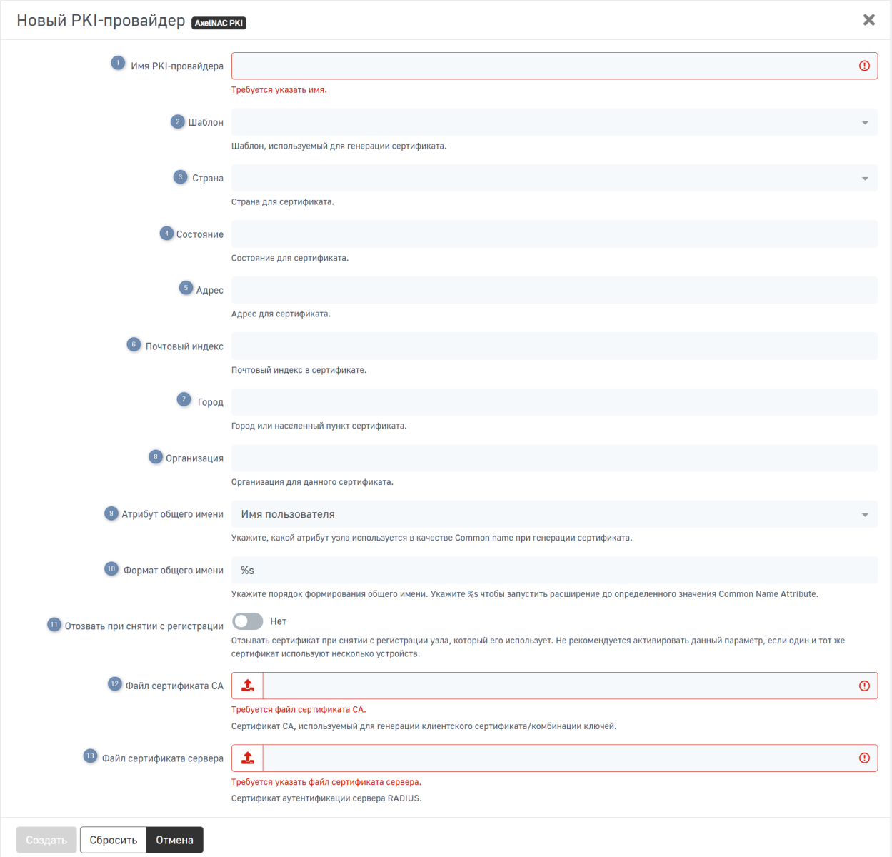 - Имя PKI-провайдера — имя провайдера, которое будет отображаться в таблице со списком всех PKI-провайдеров. Имя может содержать только цифры, латинские буквы, дефисы, точку и знак подчеркивания. Задается при создании рпровайдера и не может быть изменено в дальнейшем;