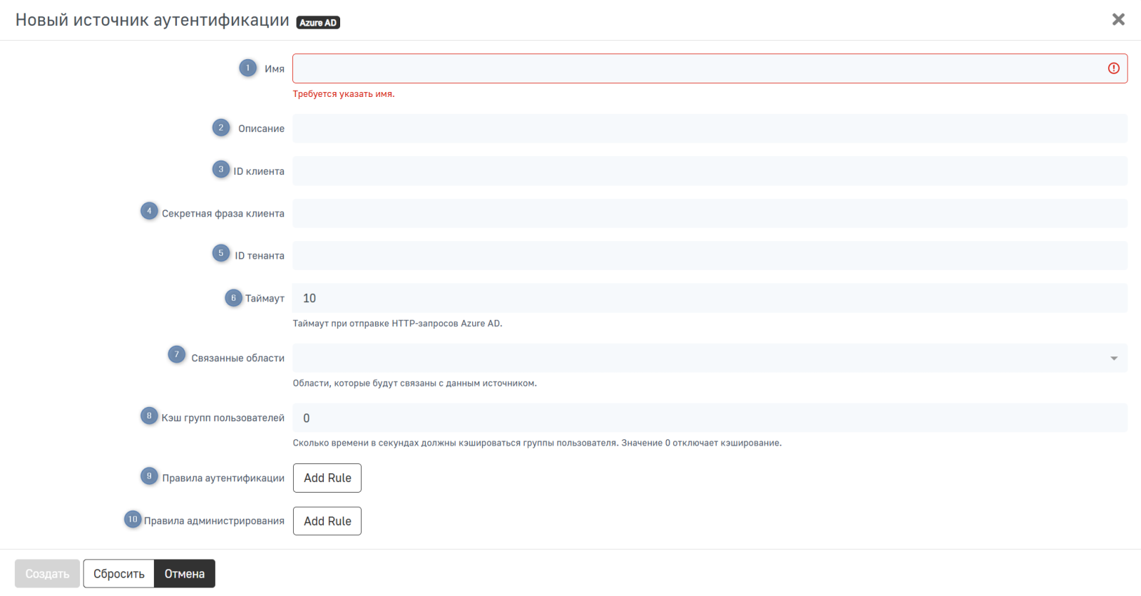 1. Имя — имя источника аутентификации, которое будет отображаться в таблице со списком всех источников аутентификации. Задается при создании источника и не может быть изменено в дальнейшем;