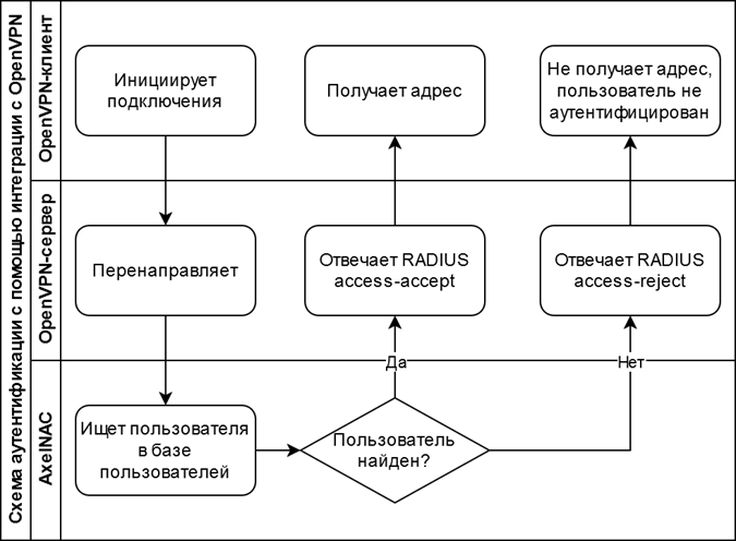 В данной статье рассматривается процесс интеграции AxelNAC с OpenVPN. Интеграция с OpenVPN может быть установлена и произведена при использовании метода аутентификации PAP (Password Authentication Protocol). Схема аутентификации с помощью интеграции с OpenVPN: