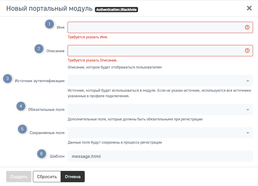 Для того чтобы создать новый модуль, заполните параметры конфигурации и нажмите Создать. Чтобы сбросить введенные параметры на стандартные значения, нажмите Сбросить. Для возвращения на предыдущую страницу без сохранения выполненных на странице действий, нажмите Отменить.