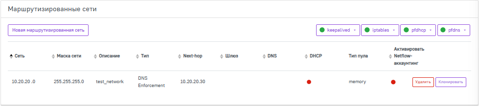 После внесения любых изменениях в раздел Маршрутизированные сети необходимо перезапустить службы keepalived, iptables, pfdhcp, pfdns.