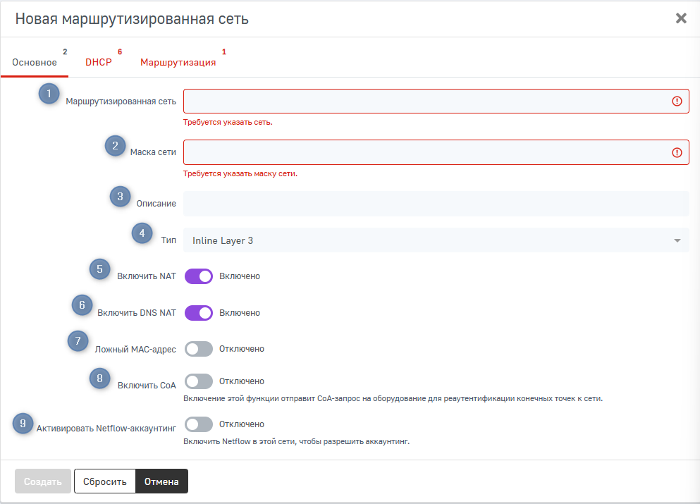 - Тип — тип сети (например, Inline Layer 3). При выборе одного из доступных типов маршрутизированной сети появляются дополнительные вкладки DHCP, Маршрутизация.