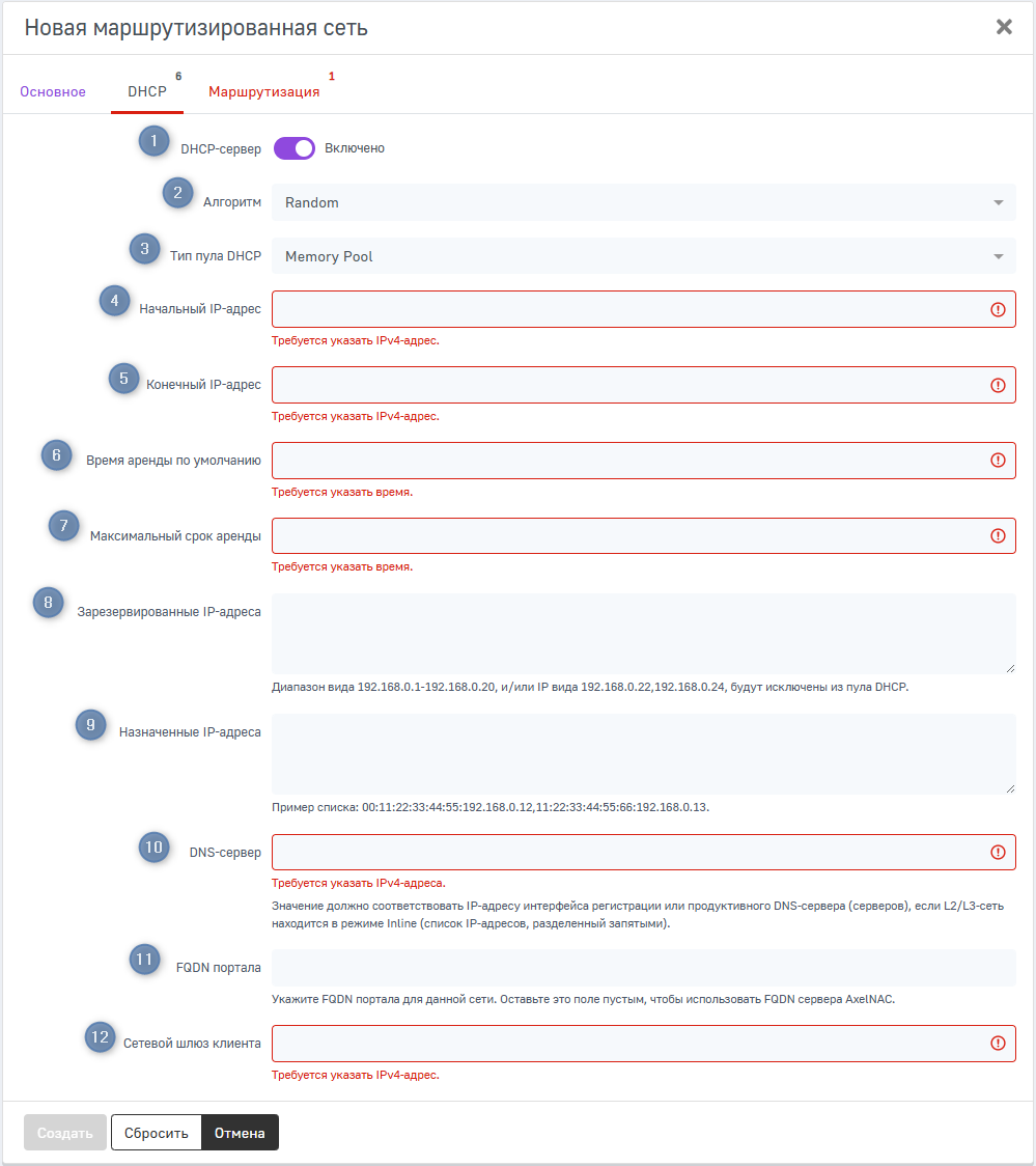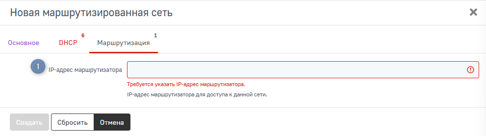 Для того, чтобы создать новую маршрутизированную сеть, заполните параметры конфигурации и нажмите Создать. Чтобы сбросить введенные параметры на стандартные значения, нажмите Сбросить. Для возвращения на предыдущую страницу без сохранения выполненных на странице действий нажмите Отменить.