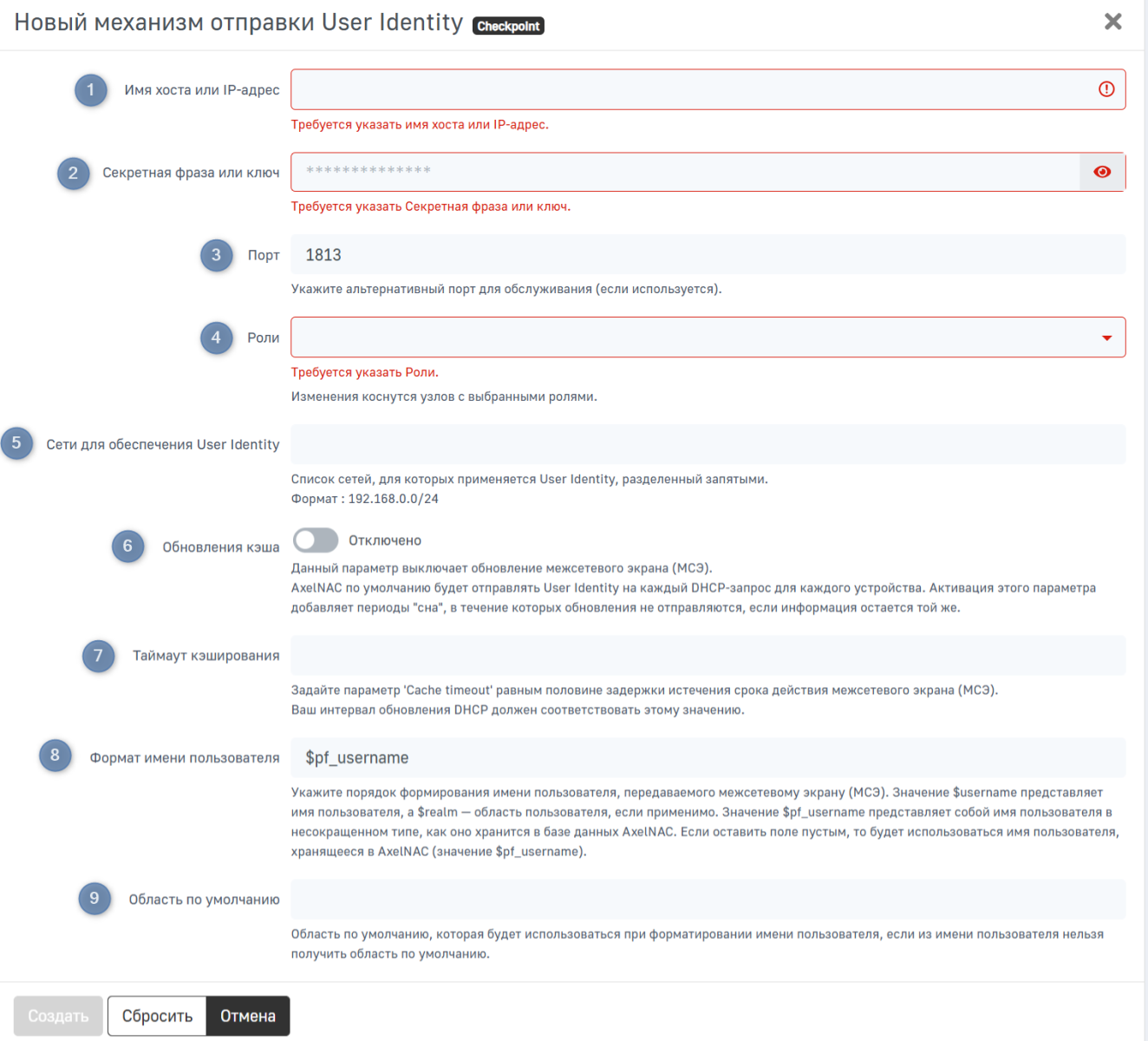 Для настройки перейдите в раздел Конфигурация → Интеграция → Механизм отправки User Identity, нажмите Новый механизм отправки User Identity и в выпадающем списке выберите Checkpoint.