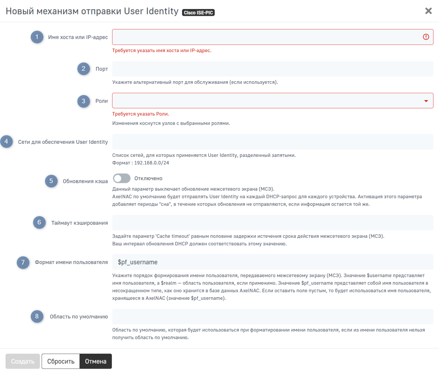 Для настройки перейдите в раздел Конфигурация → Интеграция → Механизм отправки User Identity, нажмите Новый механизм отправки User Identity и в выпадающем списке выберите Cisco ISE-PIC.