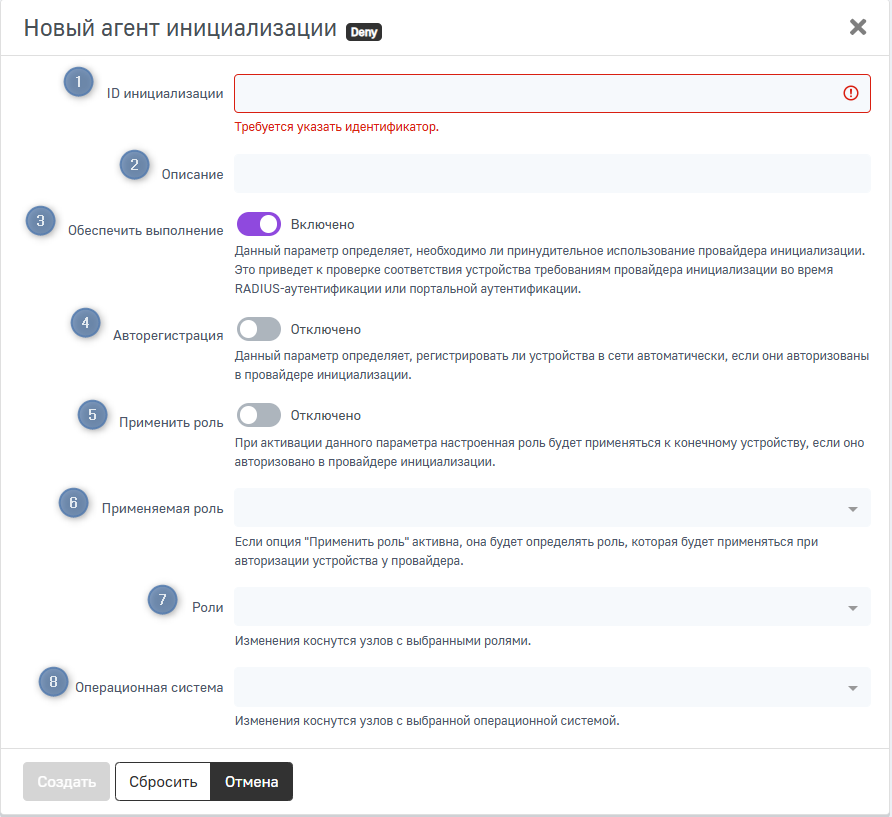 Для того чтобы создать новый агент инициализации, нажмите Новый агент инициализации в левом верхнем углу страницы и в выпадающем списке выберите тип агента Deny. После этого откроется меню конфигурации нового агента инициализации.