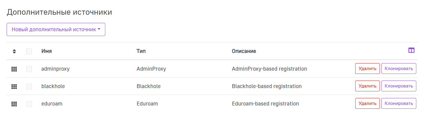 В данной таблице отображаются источники, использующиеся для регистрации всех пользователей как из внутренней, так и из внешней сетей, которые нельзя отнести глобально к внешним и внутренним источникам аутентификации.