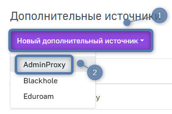Для того чтобы создать новый внутренний источник аутентификации, нажмите Новый дополнительный источник в левом верхнем углу страницы и выберите желаемый тип источника из выпадающего списка. После этого откроется меню конфигурации нового дополнительного источника аутентификации.