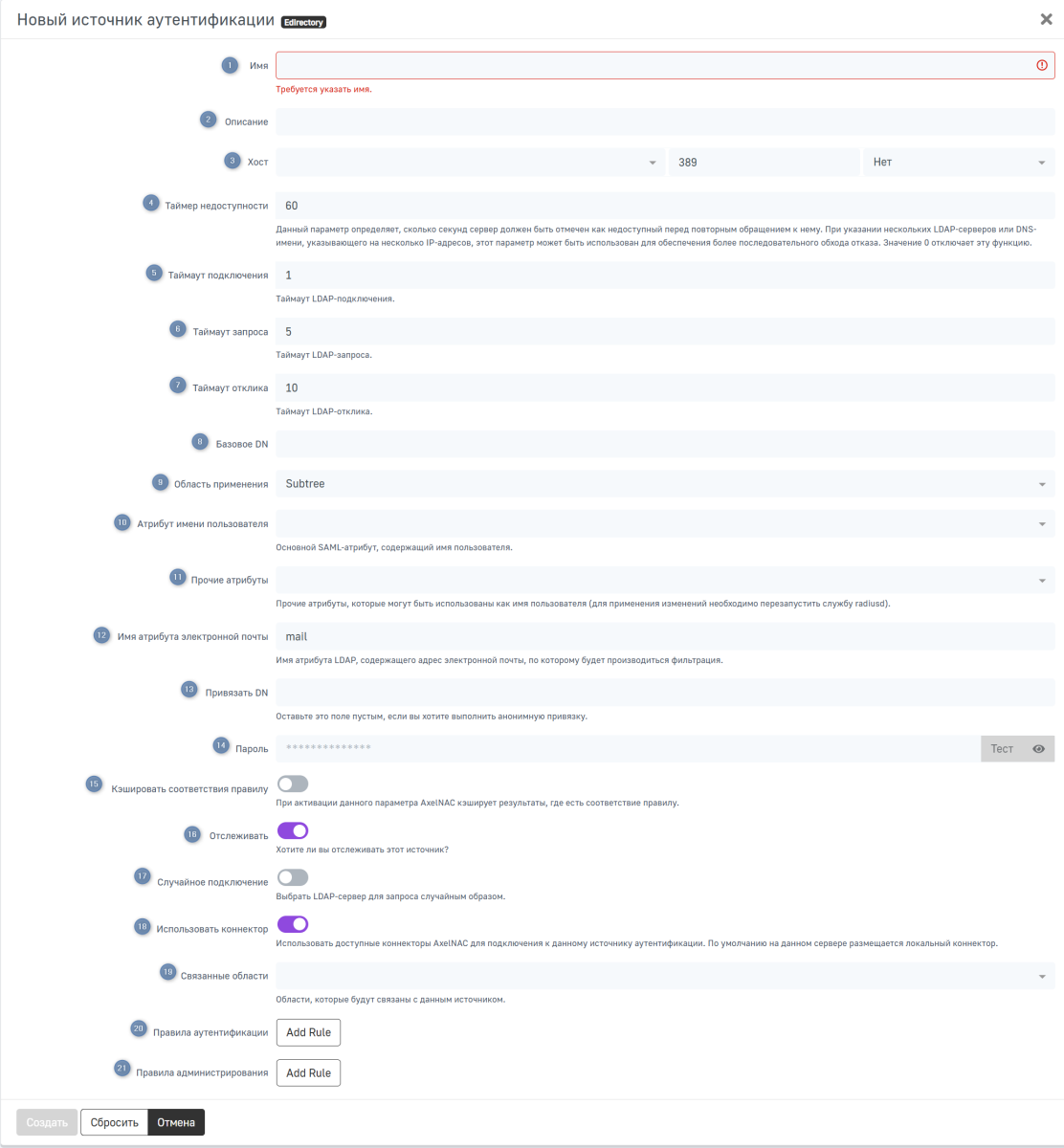 18. Использовать коннектор — использовать доступные коннекторы AxelNAC для подключения к данному источнику аутентификации. По умолчанию на данном сервере размещается локальный коннектор. Использование удаленных коннекторов в настоящее время поддерживается только на автономном исполнении;