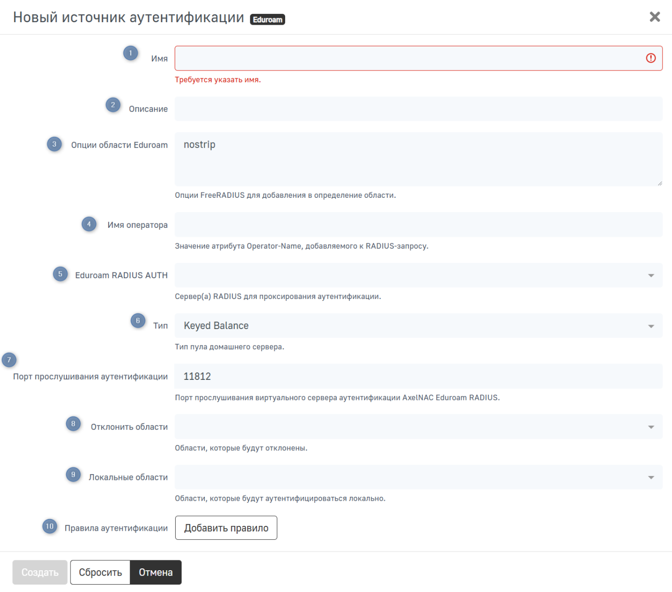 - Eduroam RADIUS AUTH — сервер(ы) RADIUS для проксирования аутентификации;