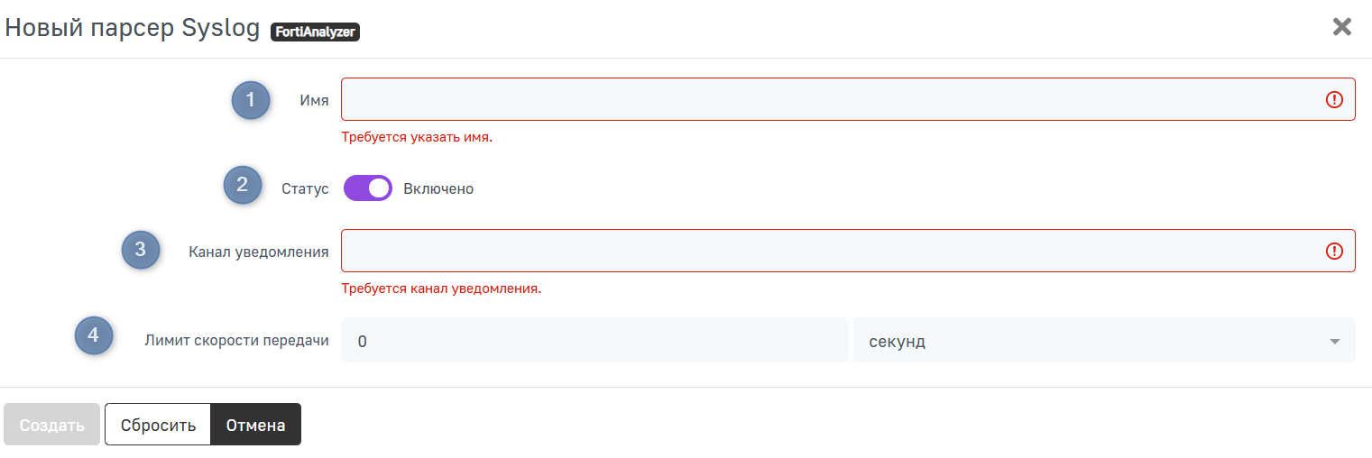 Для настройки парсера FortiAnalyzer перейдите в раздел Конфигурация → Интеграция → Парсеры Syslog → Новый парсер Syslog и выберите значение FortiAnalyzer в выпадающем списке.