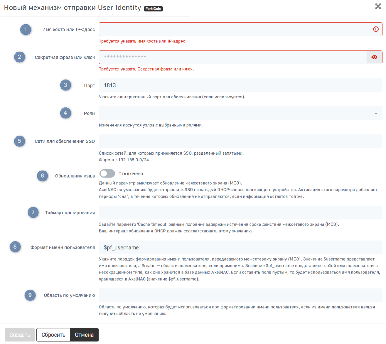 Для настройки перейдите в раздел Конфигурация → Интеграция → Механизм отправки User Identity, нажмите Новый механизм отправки User Identity и в выпадающем списке выберите FortiGate.