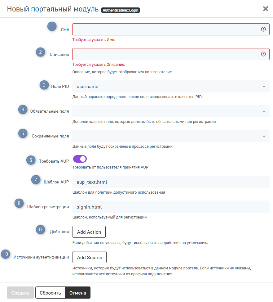 - Источник аутентификации — источник, который будет использоваться в модуле. Оставьте поле пустым, чтобы использовались все источники, указанные в профиле подключения.