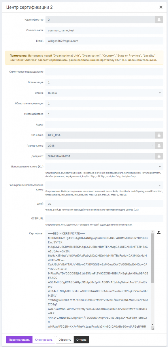 Пример заполнения формы создания центра сертификации