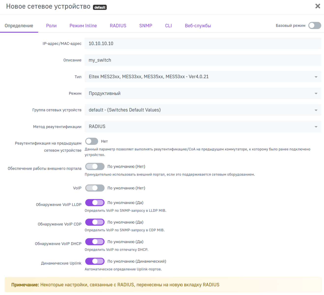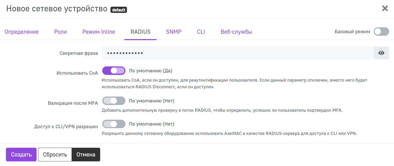 После этого каждая вводимая команда будет проходить авторизацию на сервере. Настройка конфигурации коммутатора в AxelNACШаг 1. Перейдите в раздел Конфигурация → Политики и контроль доступа → Сетевые устройства, нажмите кнопку Новое сетевое устройство и в выпадающем списке выберите к какой группе должно принадлежать устройство (по умолчанию создана группа default).