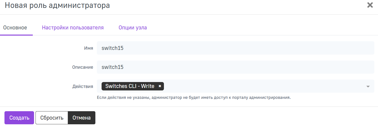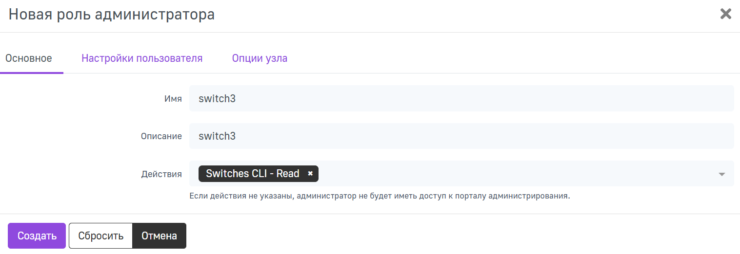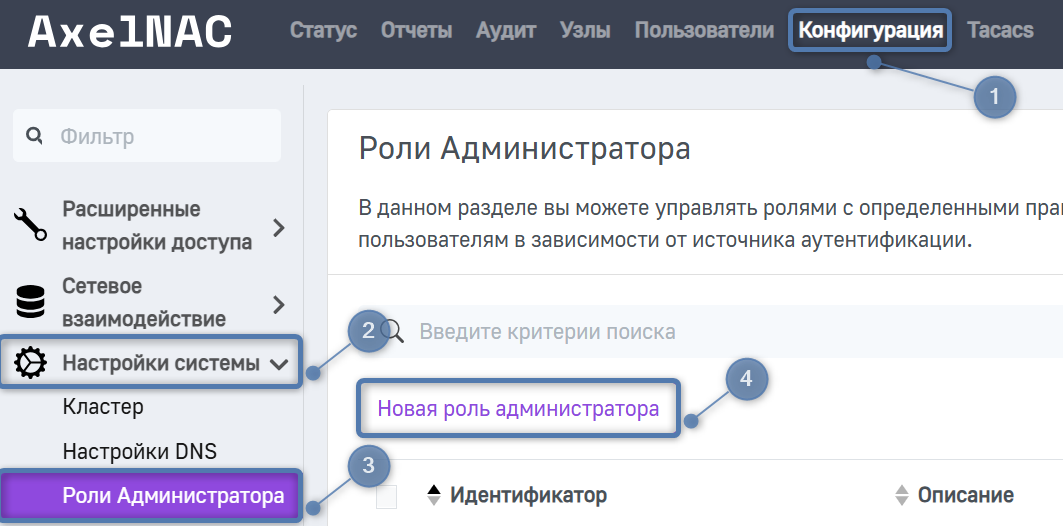 Шаг 5. Нажмите Создать в левом нижнем углу окна. Настройка RADIUS-авторизации администраторов в AxelNACШаг 1. Перейдите в раздел Конфигурация → Настройки системы → Роли Администратора, нажмите кнопку Новая роль администратора.