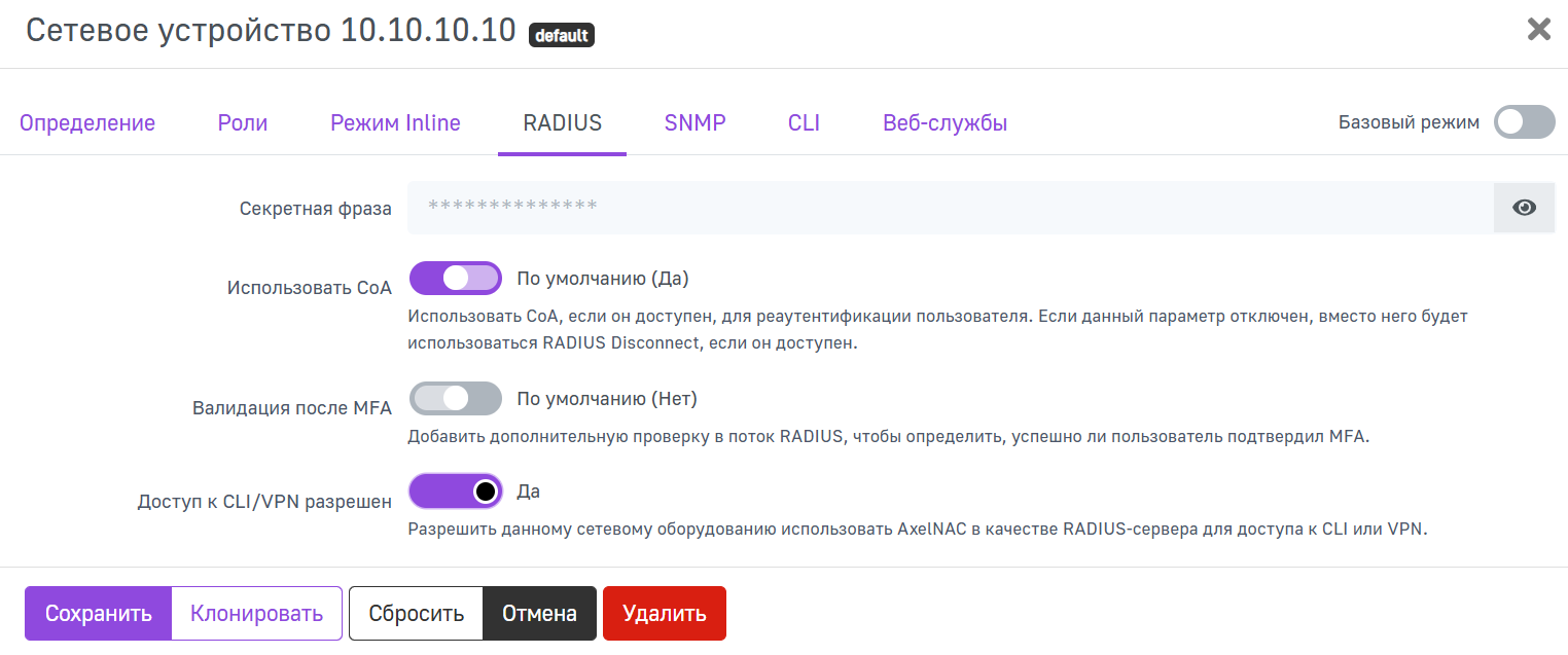 Шаг 5. Далее вернитесь в раздел Конфигурация → Политики и контроль доступа → Сетевые устройства и выберите нужное устройство; Шаг 6. На вкладке RADIUS включите параметр Доступ к CLI/VPN разрешен.