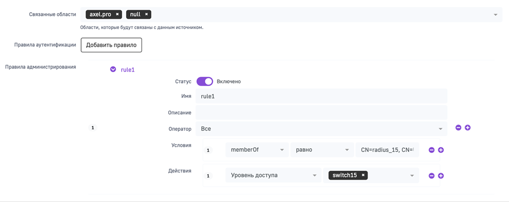 Настройка RADIUS-авторизации администраторовЕсли ранее выполнялась настройка 802.1x и MAC-авторизации, пропустите шаги 1 и 2. Для настройки разграничения доступа к сетевому оборудованию, необходимо выполнить следующие действия: Шаг 1. Активируйте работу RADIUS-сервера с помощью следующей команды: