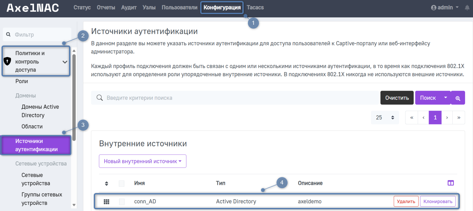 Шаг 7. Далее перейдите в Конфигурация → Политики и контроль доступа → Источники аутентификации и откройте настроенный источник Active Directory. В данном примере предполагается, что источник аутентификации Active Directory уже настроен. Подробную информацию можно посмотреть в статье с описанием настройки аутентификации с помощью Microsoft Active Directory.