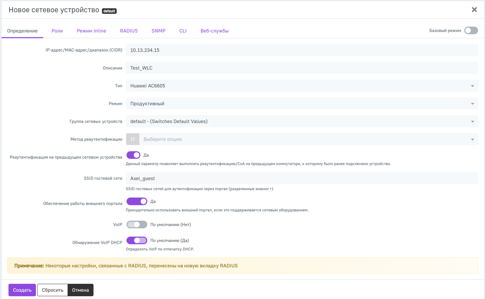 После того как Huawei WLC настроен, необходимо настроить его профиль для AxelNAC.