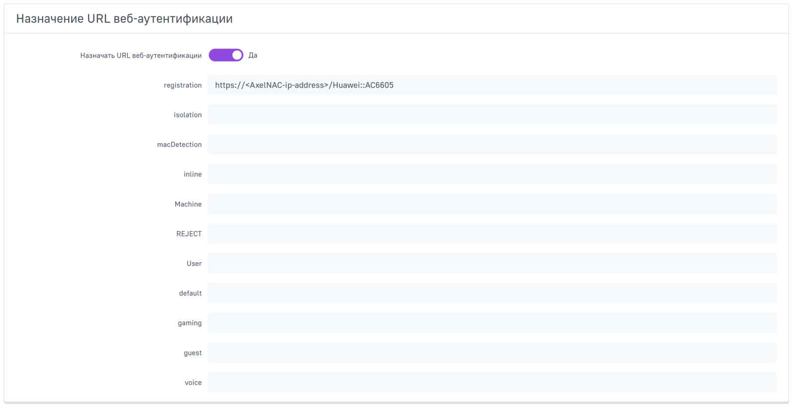 Шаг 11. Укажите для роли registration значение "http://<AxelNAC-ip-address>/Huawei::AC6605", уникальная ссылка будет генерироваться автоматически. Если вы хотите перенаправлять пользователей на HTTPS-портал, просто укажите значение "https://<AxelNAC-ip-address>/Huawei::AC6605".
