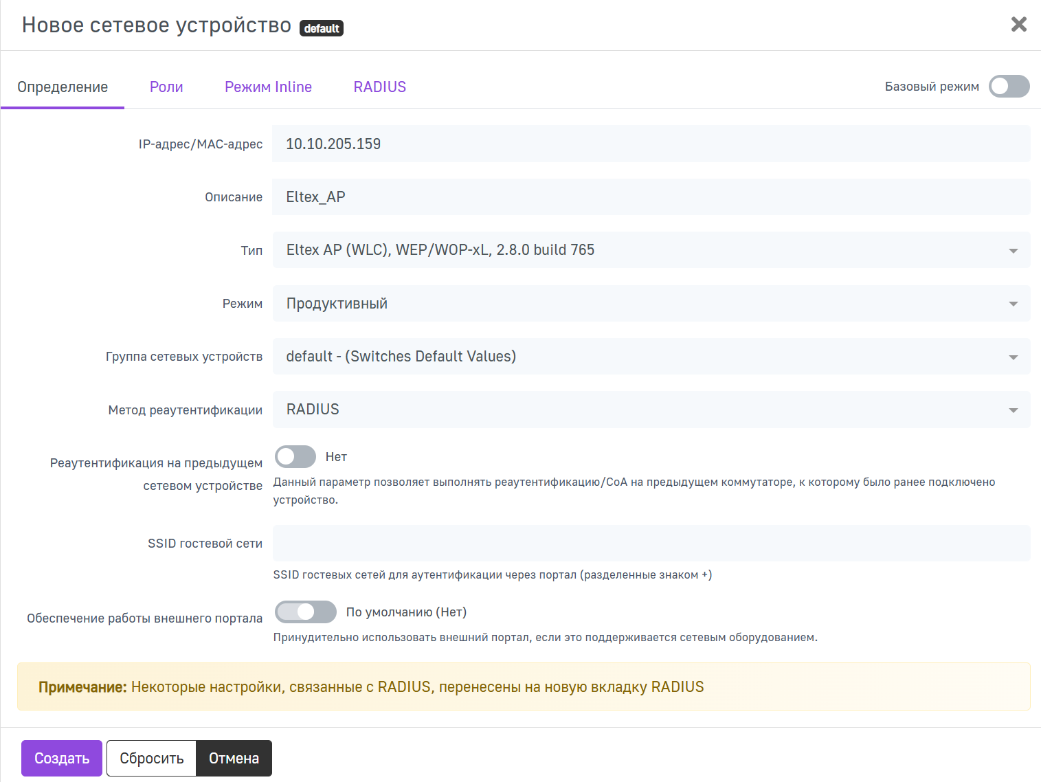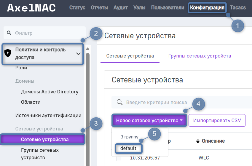 Шаг 1. Перейдите в раздел Конфигурация → Политики и контроль доступа → Сетевые устройства, нажмите кнопку Новое сетевое устройство и в выпадающем списке выберите к какой группе должно принадлежать устройство (по умолчанию создана группа default).