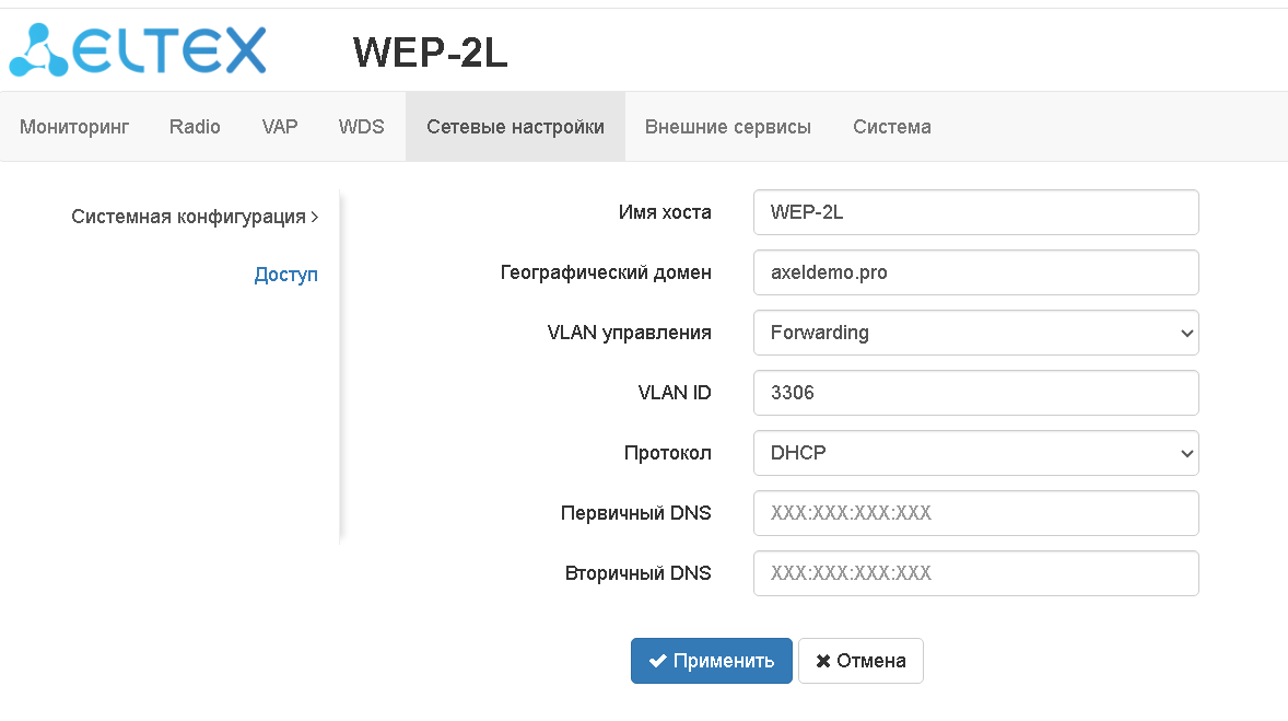 Тип: Eltex AP (WLC), WEP/WOP-xL, 2.8.0 build 765;