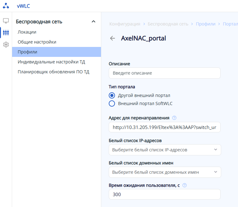 Адрес портала указывается с экранированием спецсимволов: http(s)://10.31.205.199/Eltex%3A%3AAP?switch_url=<SWITCH_URL>&ap_mac=<AP_MAC>&client_mac=<CLIENT_MAC>&wlan=<SSID>&redirect_url=<ORIGINAL_URL>&nas-ip=<NAS_IP>