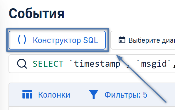 Для фильтрации событий может быть использован функционал конструктора SQL-запросов. Данный инструмент является агрегатором функций по поиску событий — каждый из блоков (колонки, условия, группировка, сортировка и лимит) может быть детально настроен, после чего результат будет отображен в разделе Превью запроса. Для доступа к данному инструменту нажмите Конструктор SQL в левом верхнем углу страницы.