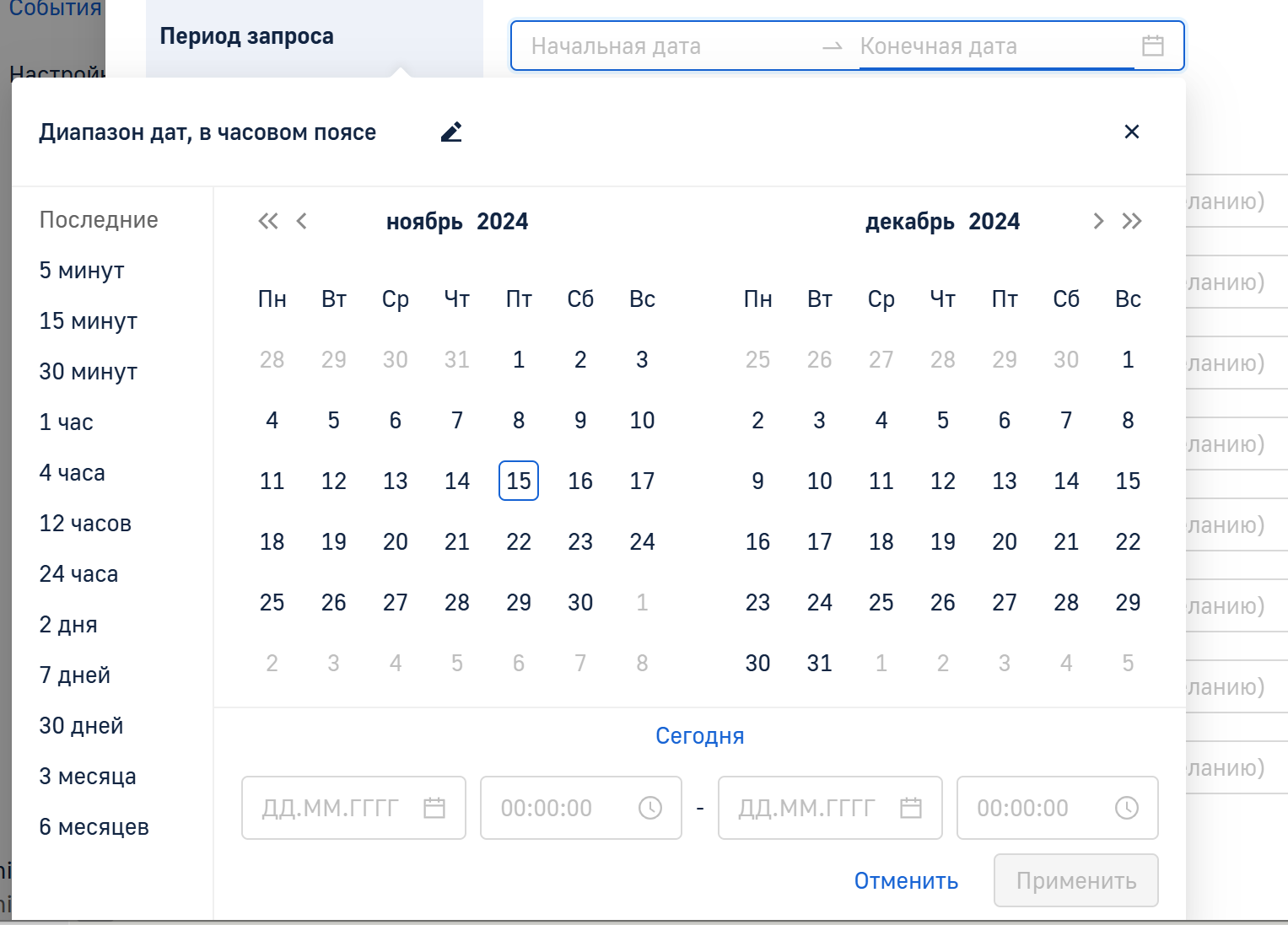 Ниже приведено описание блоков конструктора SQL. Период запросаВ данном блоке вы можете настроить фильтрацию по времени события. Для этого нажмите на окно выбора даты и укажите даты для фильтрации, либо выберите одно из предложенных значений.