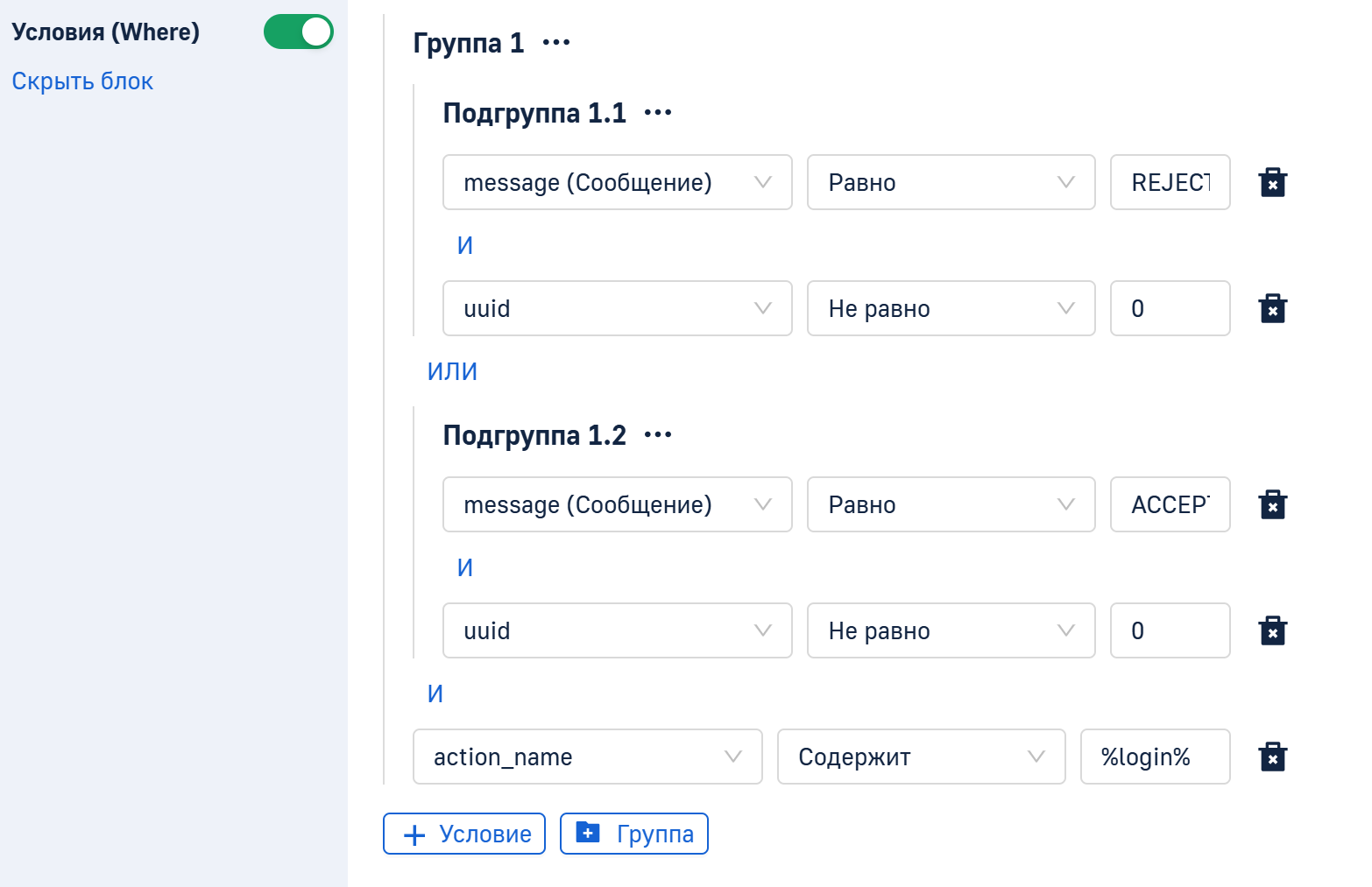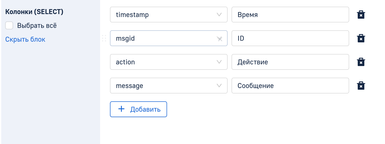 Здесь вы можете выбрать колонки из списка, а также задать им пользовательские имена для отображения. Вы также можете выбрать все колонки для запроса, нажав Выбрать все под названием блока. Для того, чтобы добавить больше колонок, нажмите Добавить. Для того, чтобы удалить колонки, нажмите на иконку корзины справа от полей конфигурации колонки. Условия (Where)Данный блок используется для настройки фильтрации таблицы со списком событий.