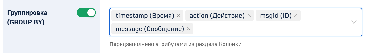 Подробное описание конфигурации фильтров приведено в статье Работа с событиями. Группировка (GROUP BY)Данный блок используется для настройки группировки колонок таблицы со списком событий. По правилам SQL, элементы в данной части должны совпадать с элементами в блоке SELECT.