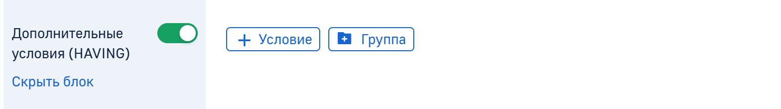 Для того, чтобы удалить атрибуты, нажмите X справа от имени атрибута. Чтобы добавить атрибут, нажмите на иконку стрелочки справа от поля выбора. Дополнительные условия (HAVING)Данный блок используется для настройки фильтрации к результатам группировки после применения агрегатных функций.