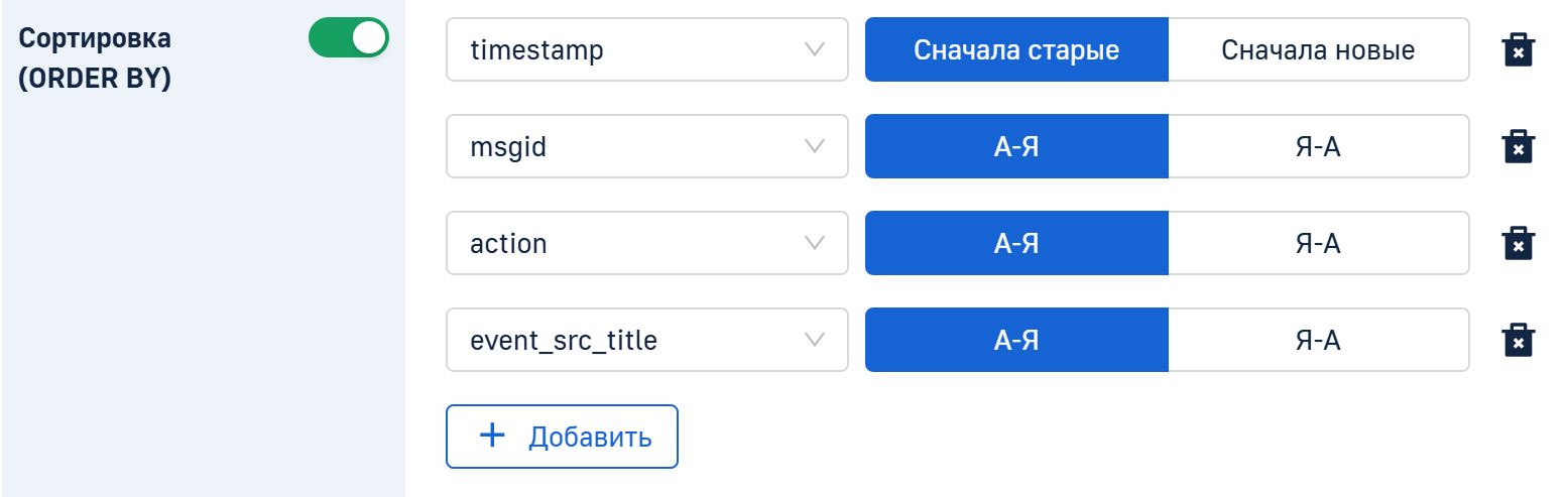 Подробное описание конфигурации фильтров приведено в статье Работа с событиями. Сортировка (ORDER BY)Данный блок используется для сортировки событий в таблице