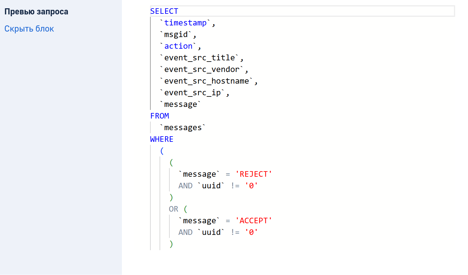 Превью запросаВ данном блоке отображается предпросмотр запроса, который был создан с помощью конструктора.