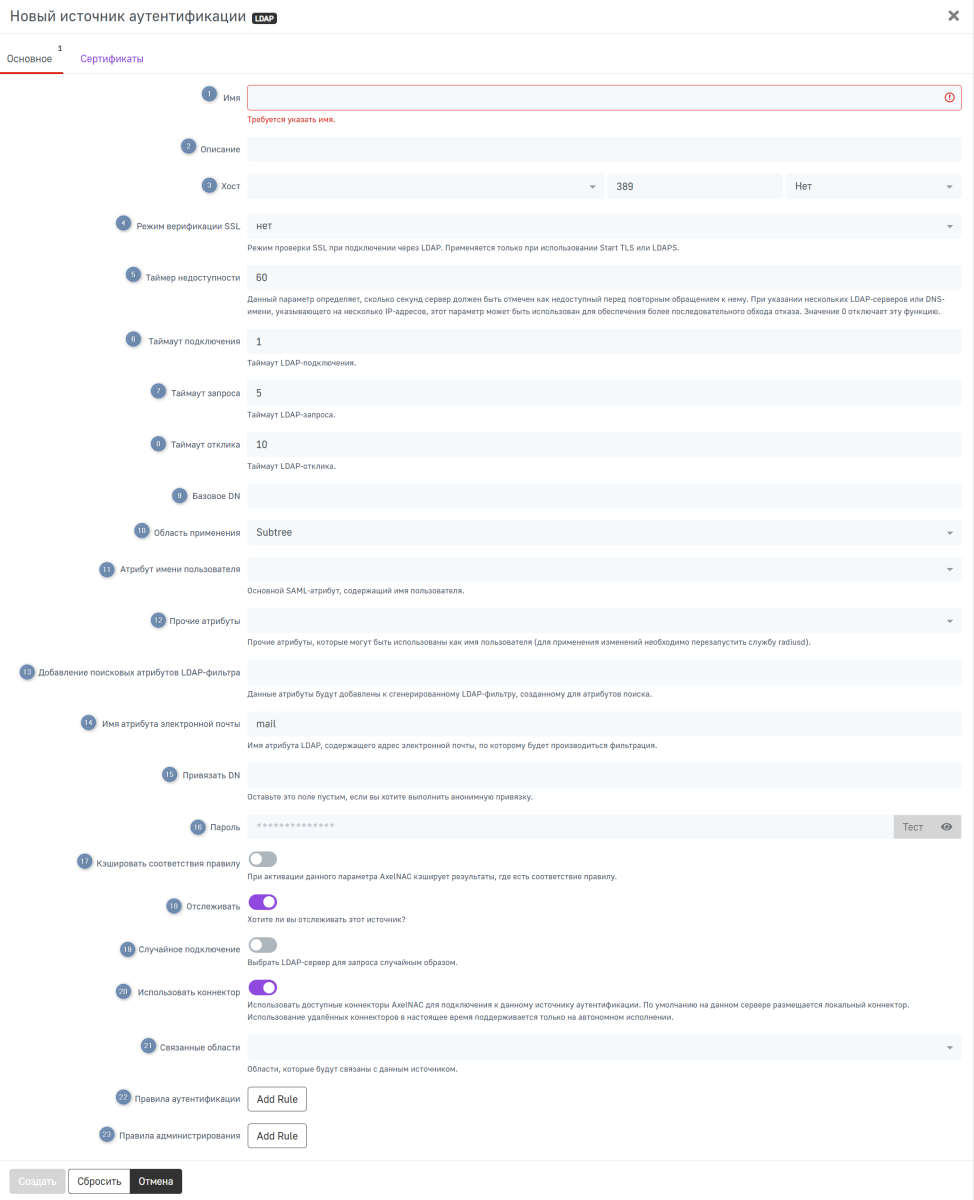 - Имя — имя источника аутентификации, которое будет отображаться в таблице со списком всех источников аутентификации. Задается при создании источника и не может быть изменено в дальнейшем;