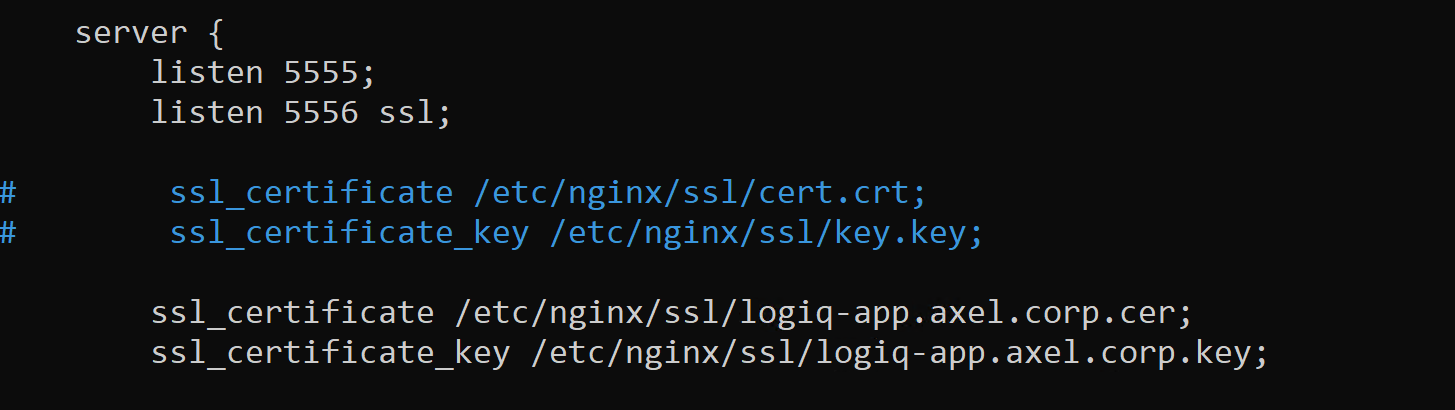 Шаг 3. В файле /opt/logiq/services/apigw/nginx.con закомментируйте неактуальные ключ и сертификат, после чего добавьте строки с новыми файлами сертификата и ключа и путь к этим файлам: