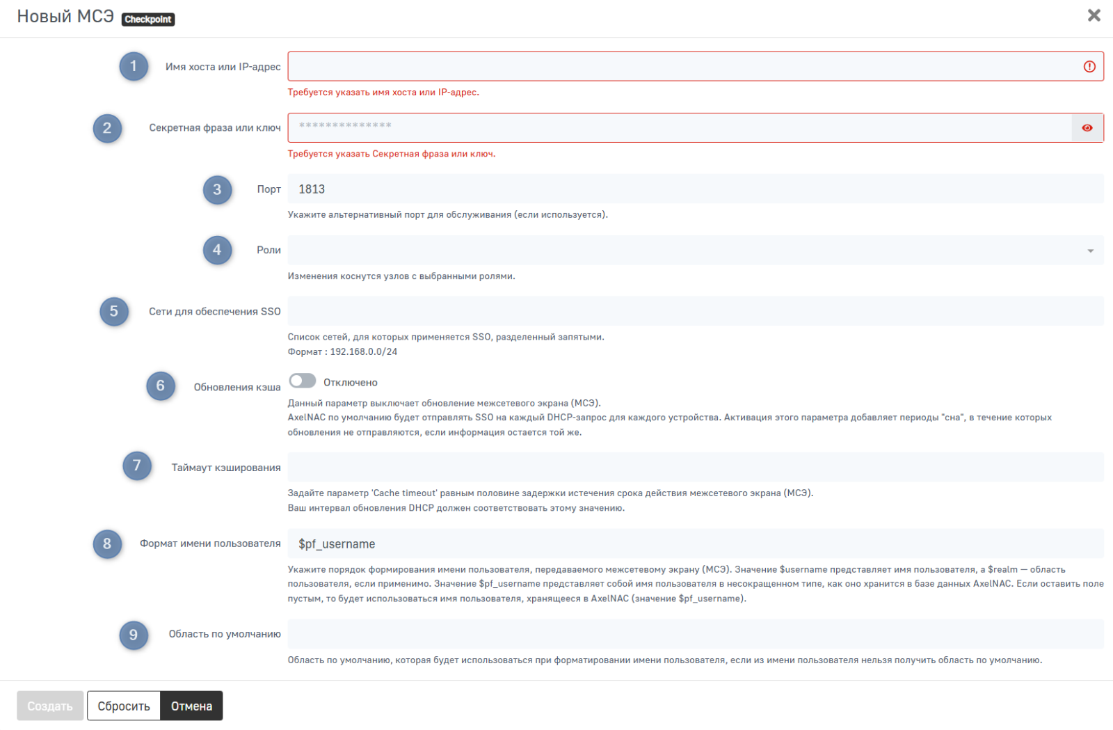 Для настройки перейдите в раздел Конфигурация → Интеграция → SSO через межсетевой экран (МСЭ), нажмите Новый межсетевой экран и в выпадающем списке выберите Checkpoint.