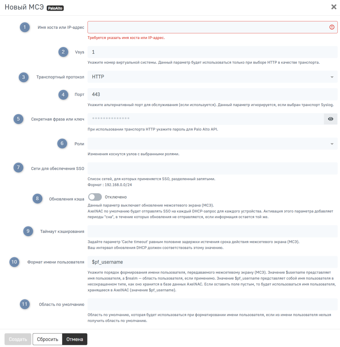 Для настройки перейдите в раздел Конфигурация → Интеграция → SSO через межсетевой экран (МСЭ), нажмите Новый межсетевой экран и в выпадающем списке выберите PaloAlto.
