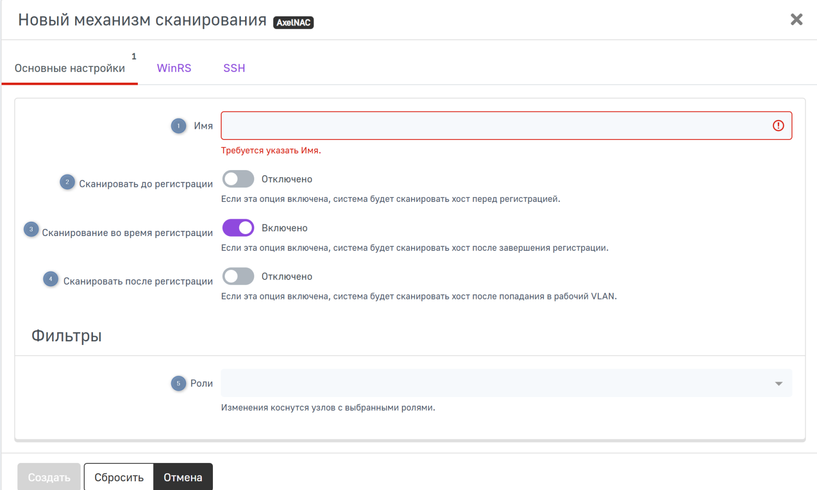 Для того чтобы добавить новый механизм сканирования в AxelNAC, выполните следующие действия: Шаг 1. В разделе Конфигурация → Соответствие → Сканеры нажмите Новый механизм сканирования и выберите AxelNAC в выпадающем списке. Шаг 2. Заполните следующие параметры на открывшейся вкладке Основные настройки: