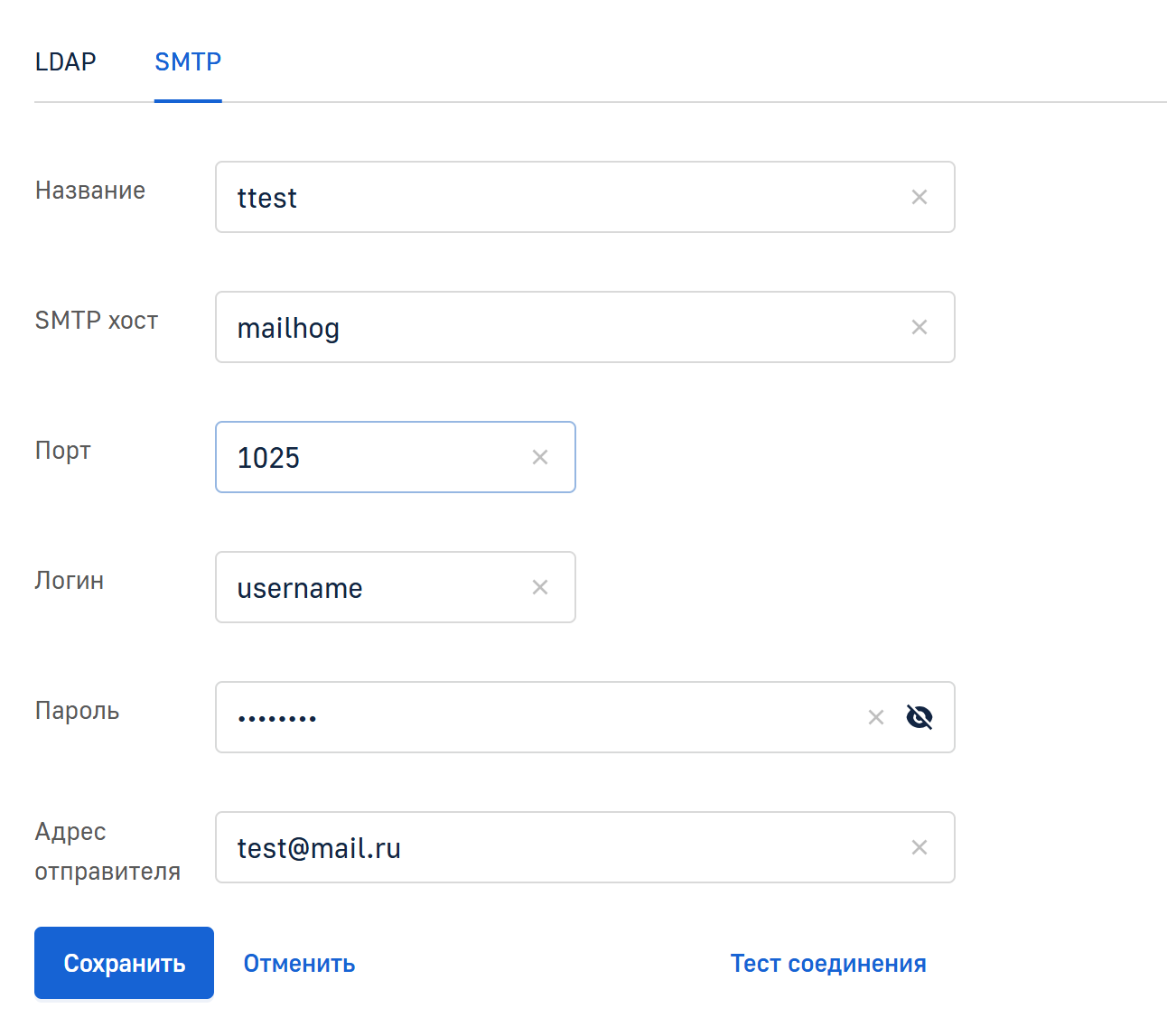 В случае, если вы хотите проверить работу ранее работающей интеграции с SMTP-сервером, нажмите Тест соединения в нижней части страницы.