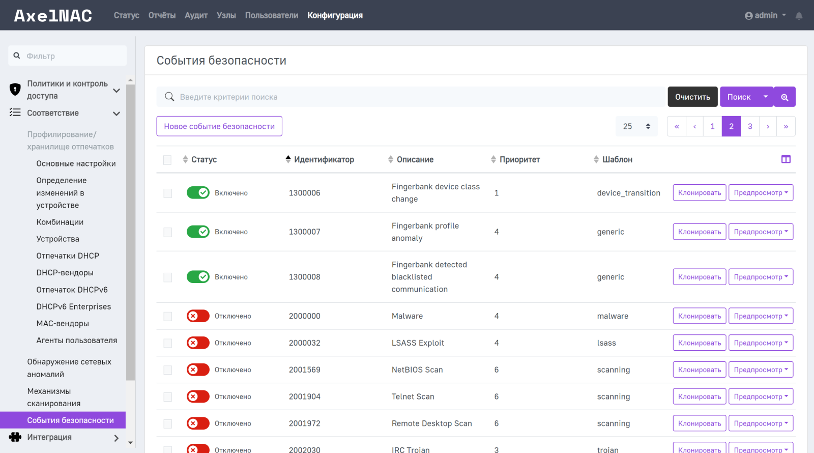 События безопасности — это модуль, который позволяет реагировать на действия и состояния конечных устройств. AxelNAC позволяет реагировать на смену профиля устройства (тип устройства, MAC-вендора, отпечаток DHCP и т.д.), на несоответствие политикам ИБ устройства, а также реагировать на превышение устройством порогового уровня потребляемого трафика.