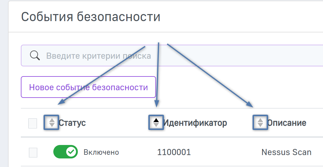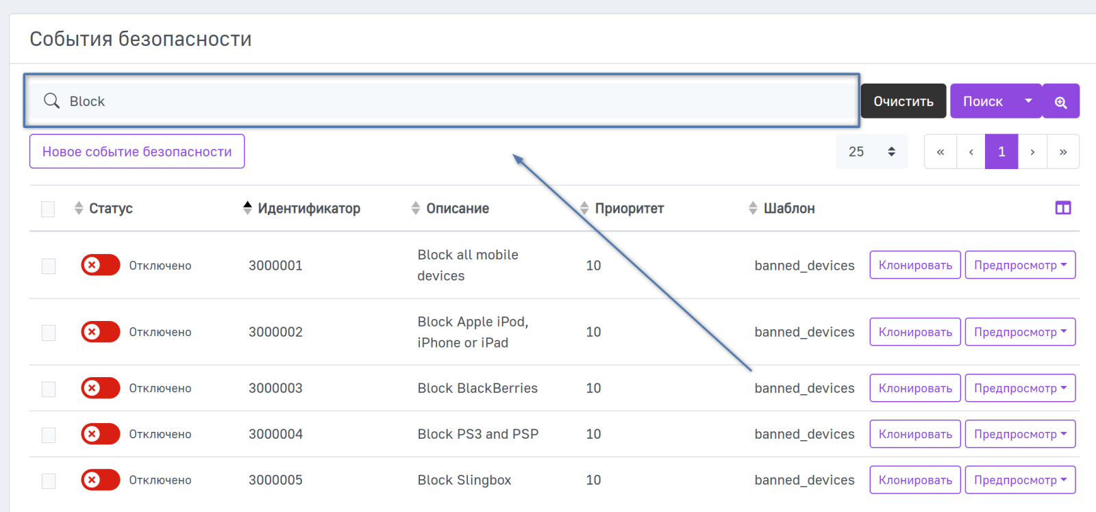 Для того, чтобы выполнить поиск событий безопасности, нажмите на строку поиска в верхней части списка, введите ключевое слово для поиска и нажмите Поиск. В качестве ключевого слова может использоваться идентификатор или описание события безопасности, а также имя шаблона HTML-страницы, который будет использоваться при срабатывании события.