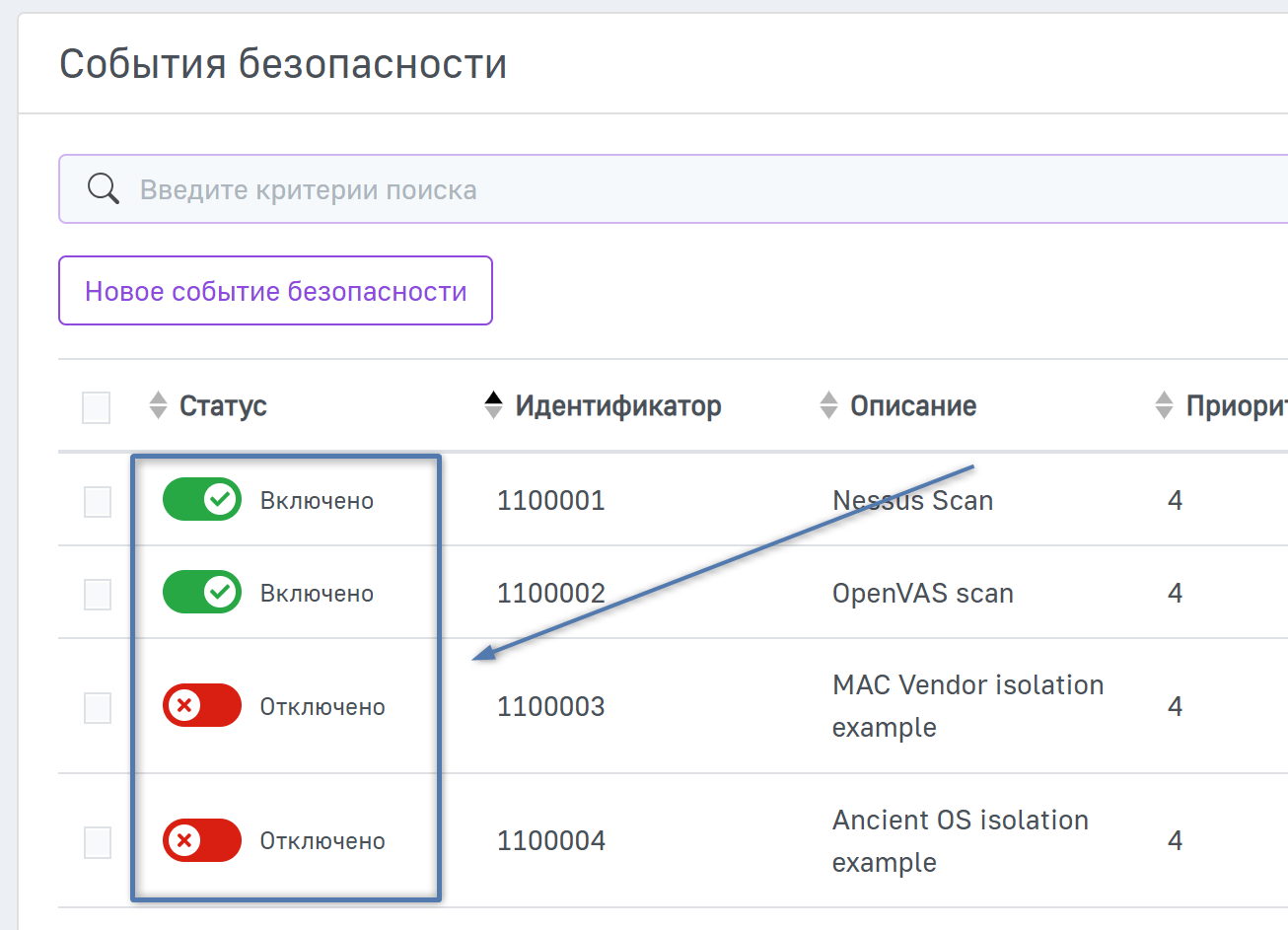 Для того, чтобы активировать/деактивировать работу события безопасности, нажмите на переключатель в колонке Статус.