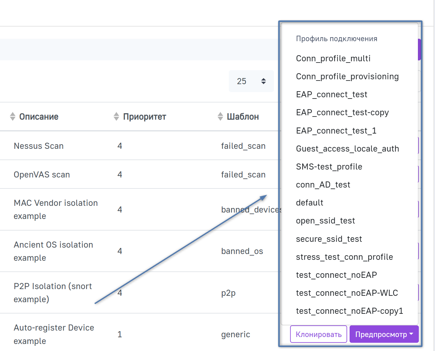 Для того, чтобы выполнить предпросмотр HTML-страницы, отображаемой при срабатывании события безопасности, нажмите Предпросмотр в правой части таблицы. При нажатии вам будет предложено выбрать профиль подключения, для которого вы хотите выполнить предпросмотр. После выбора профиля подключения будет отображена HTML-страница.