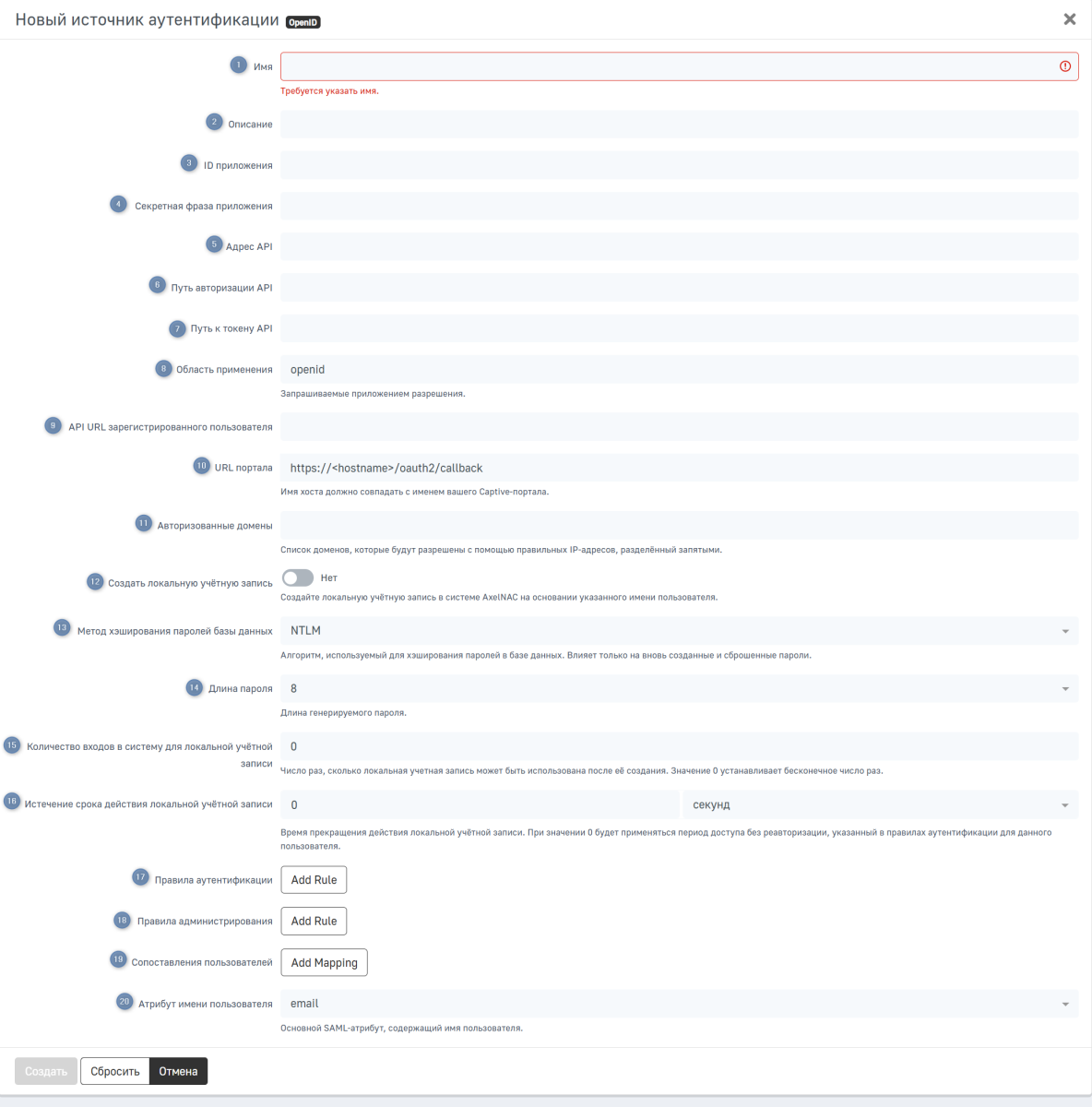 - Имя — имя источника аутентификации, которое будет отображаться в таблице со списком всех источников аутентификации. Задается при создании источника и не может быть изменено в дальнейшем;