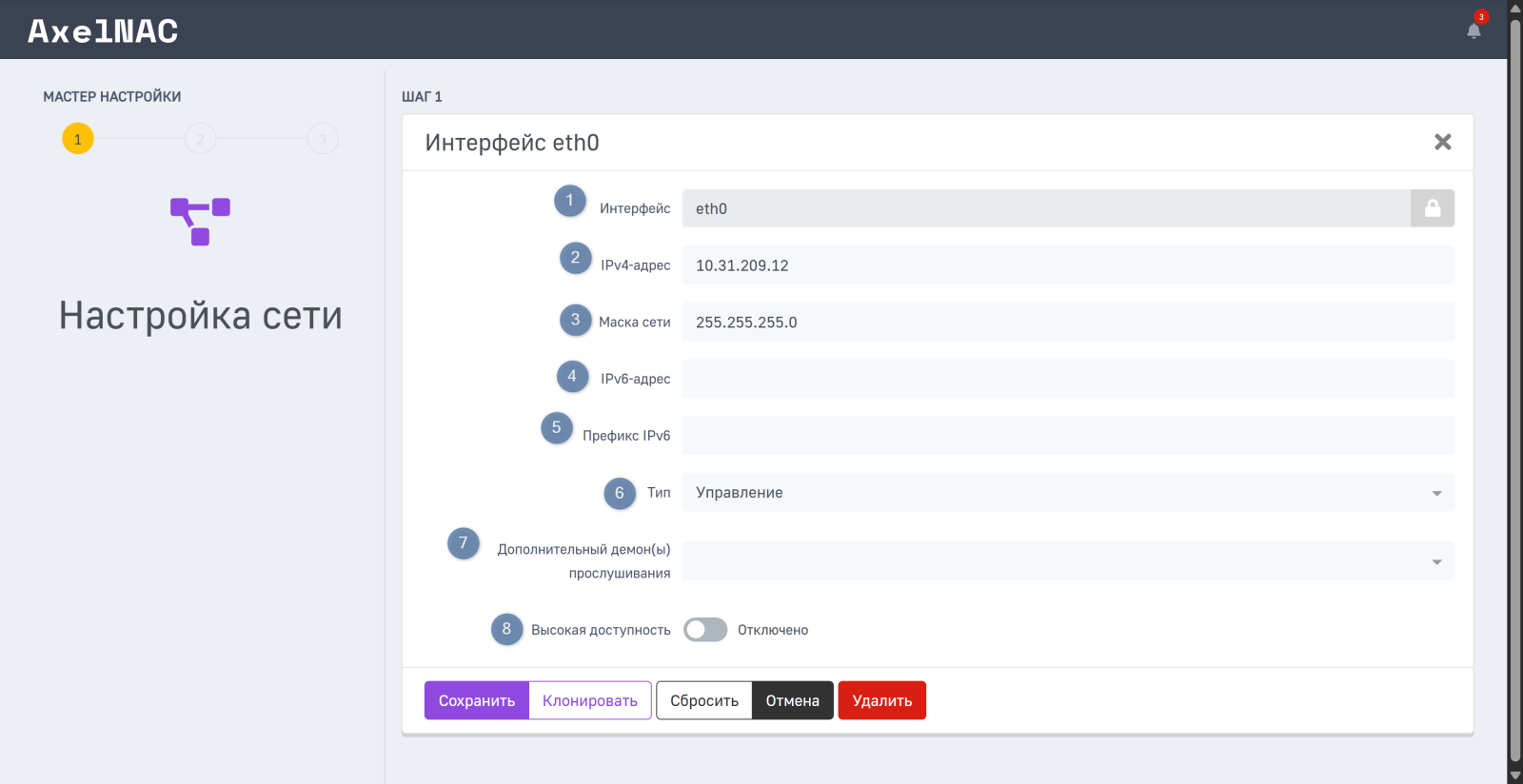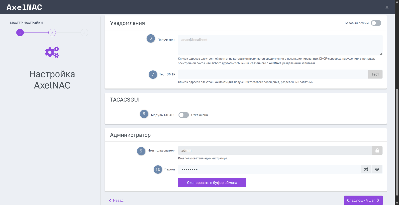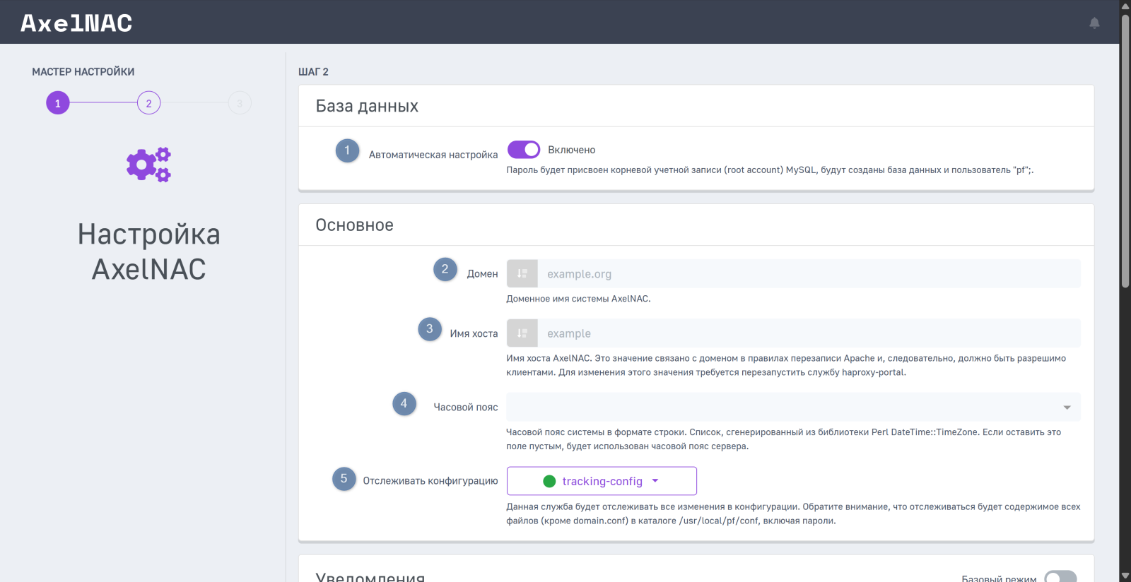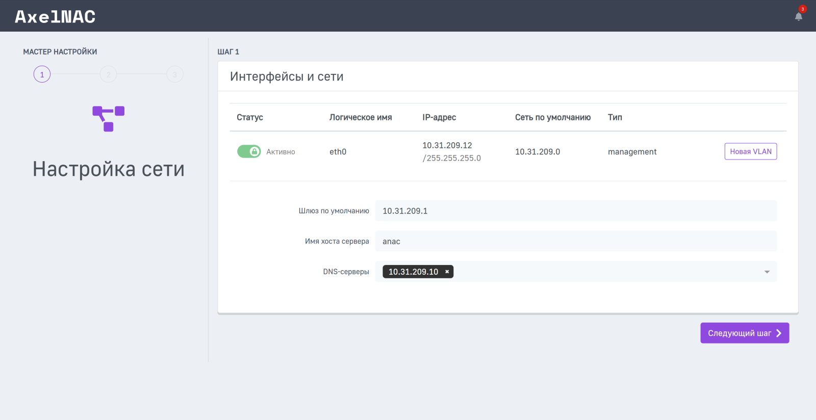 Для первоначальной настройки AxelNAC в веб-конфигураторе выполните настройки в Мастере настроек.